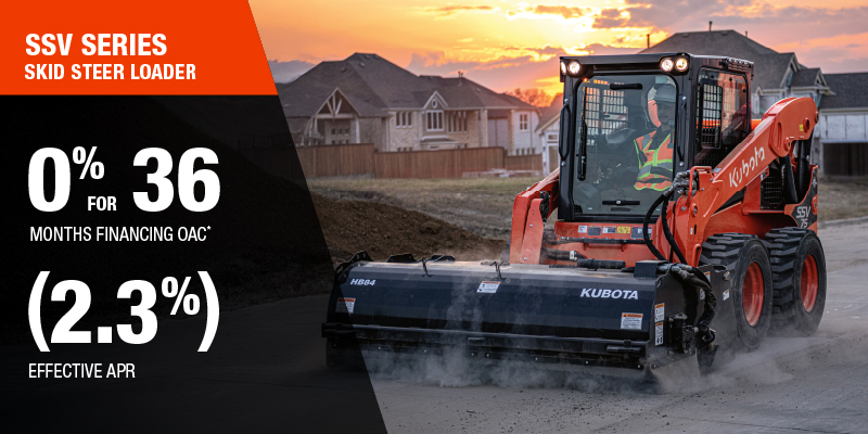 *For all offers: Prices and payments include freight and other applicable fees (including environmental fees, administration fees, set-up fees, and dealer fees). Taxes, delivery fees, insurance and registration are extra. Dealer may sell for less. Dealer order/trade may be necessary (but may not be available in all cases). Some restrictions apply. Offers valid only at participating dealers in Canada and are subject to change, cancellation or extension at any time without notice or obligation. Minimum down payment of 10% required for financing offers on turf and agricultural products. Specifications, features, illustrations and equipment shown are based on the latest available information at the time of publication. Some models are shown with optional accessories available at extra cost. Although descriptions are believed to be correct, accuracy cannot be guaranteed. We reserve the right to make changes at any time, without notice or obligation to specifications, accessories, materials, models, prices, payments and other information. Offer valid until January 12, 2026. See your participating Kubota dealer or visit www.kubota.ca for complete details.